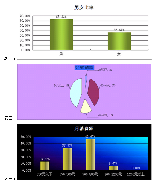 表二:表明不同年龄的消费群体在手机话费的月消费额,绝大多数的消费者的月消费额为50以上,可见,消费者在手机消费这块有足够可以支配的费用。